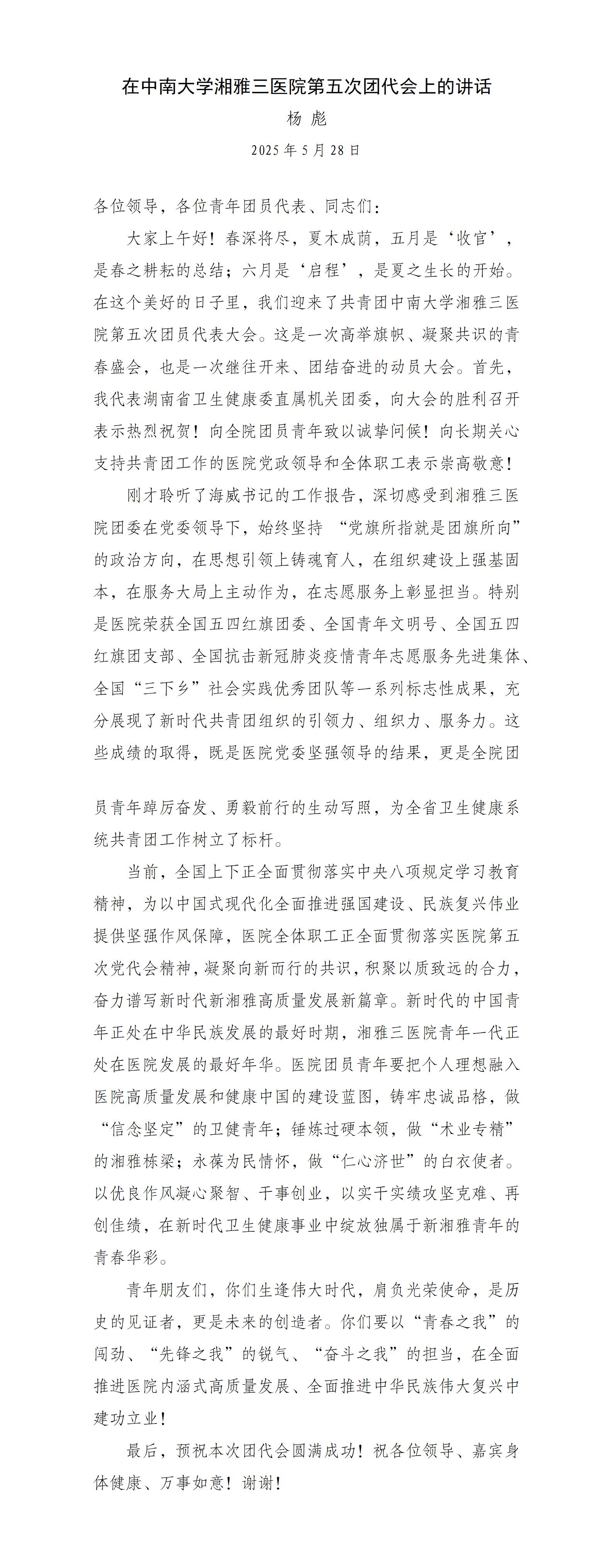 湖南省卫健委直属机关团委书记杨彪在中南大学湘雅三医院第五次团代会上的讲话